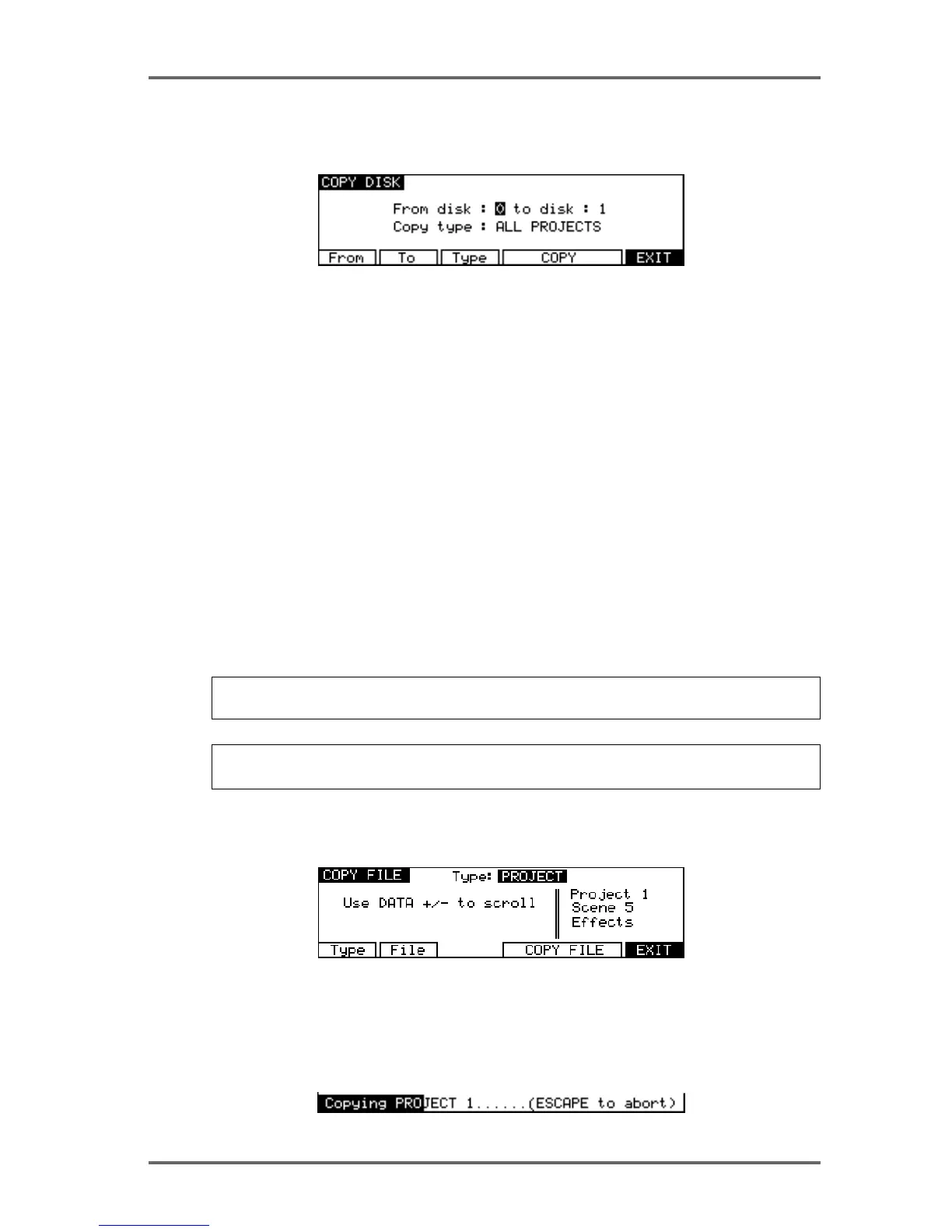 Pressing COPY (F4/F5) on the COPY DISK page, or COPY FILE (F4/F5) on the COPY FILE