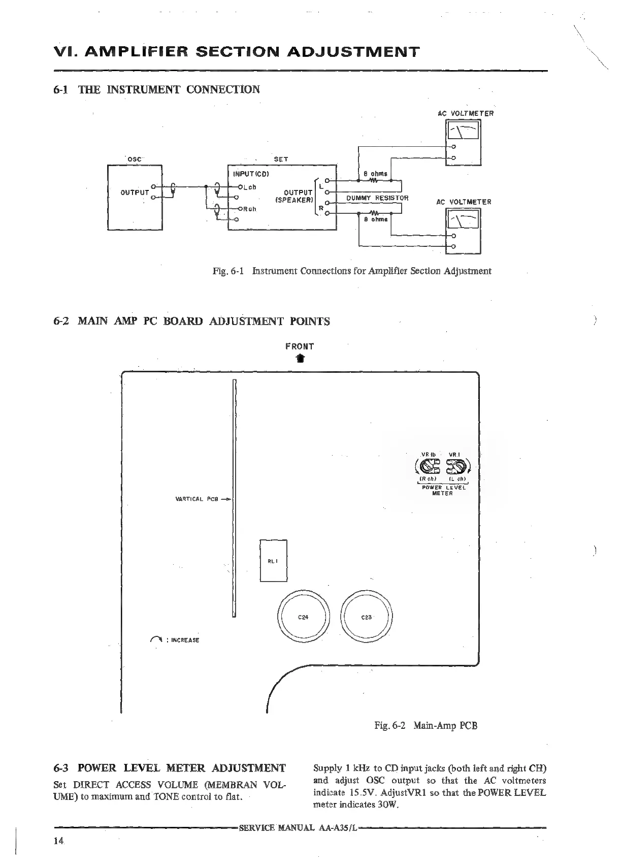 Akai AA-A35 - Amplifier Section Adjustment; The Instrument Connections; Main Amp Pc Board Adjustment Points; Power Level Meter Adjustment