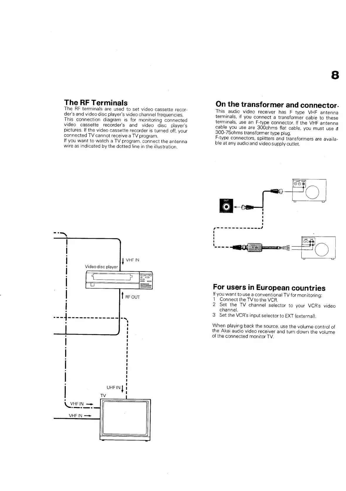 Akai AA-V205 - RF Terminals and European Use; RF Terminal Configuration for Video; Transformer and Connector Guidelines; European Country Operation Notes