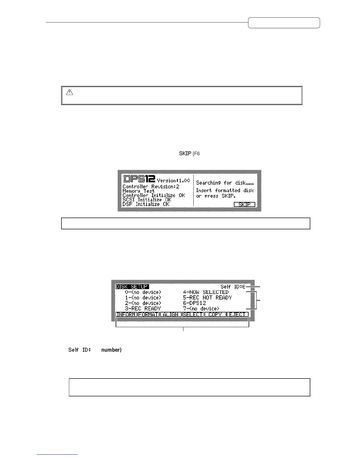 If the DPS12 does not find disk that contains a Project in the SCSI bus, it will continue to search for one while the