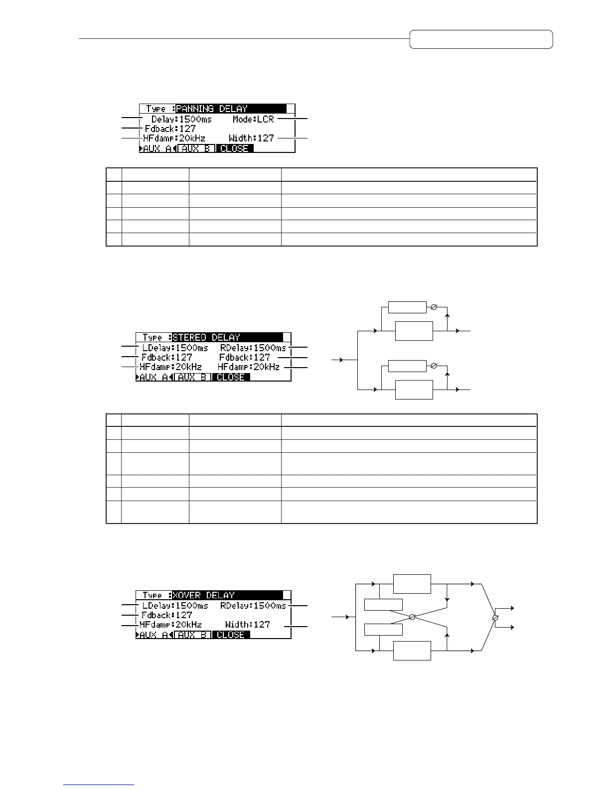 This delay effect pans the delay sound left, center, then right (LCR), or right, center, then left (RCL).