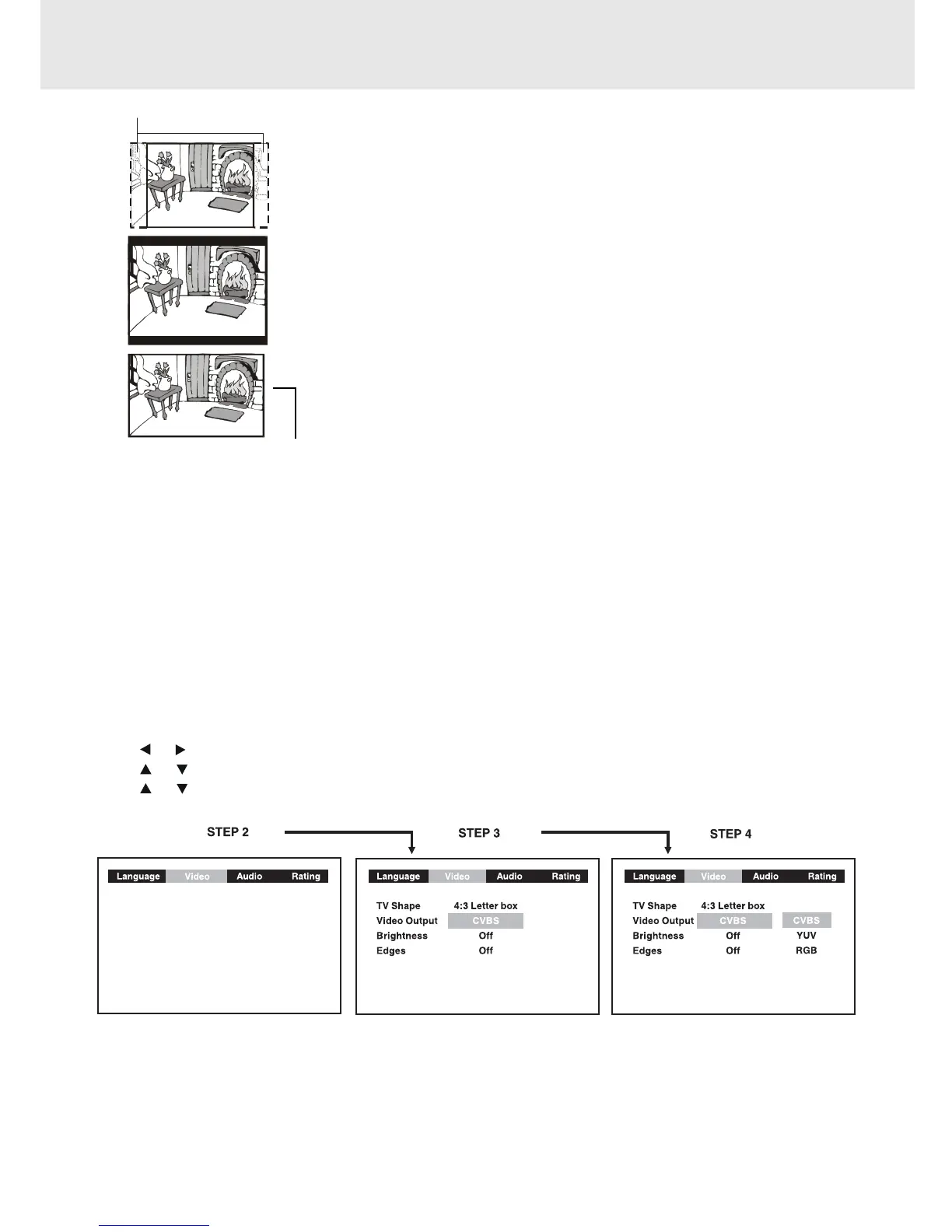 Always set Video Output in CVBS, otherwise, the picture on the TV may be distorted. If this occurs, and you cannot