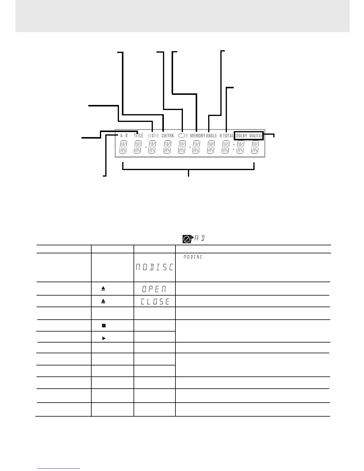 The DVD displays the information shown below on the TV screen and on the Unit's DVD display depending