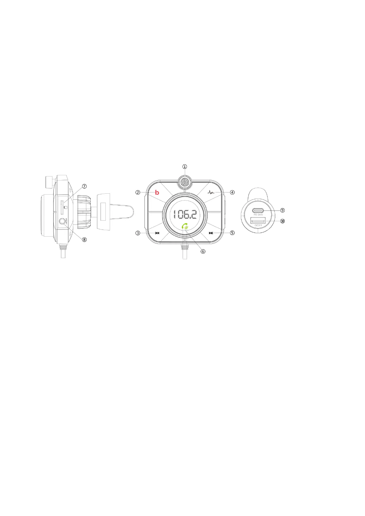 ⑥MFB (Pozastavit/Přehrát, Hlasitost +/-, FM nastavení)
