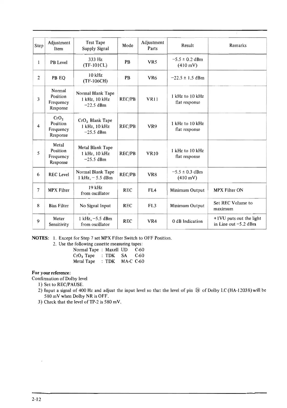 NOTES: 1. Except for Step 7 set MPX Filter Switch to