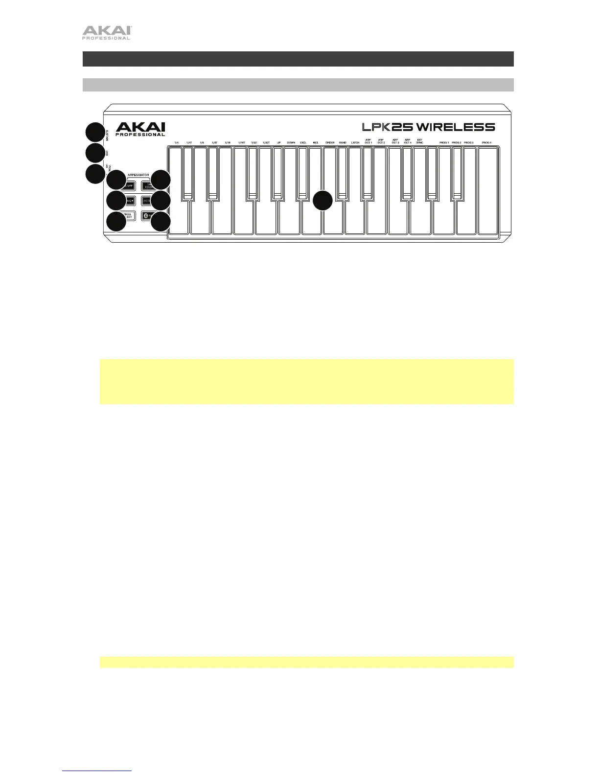 2. Netzschalter: Mit diesem Schalter können Sie LPK25 Wireless ein- oder ausschalten. Um die
