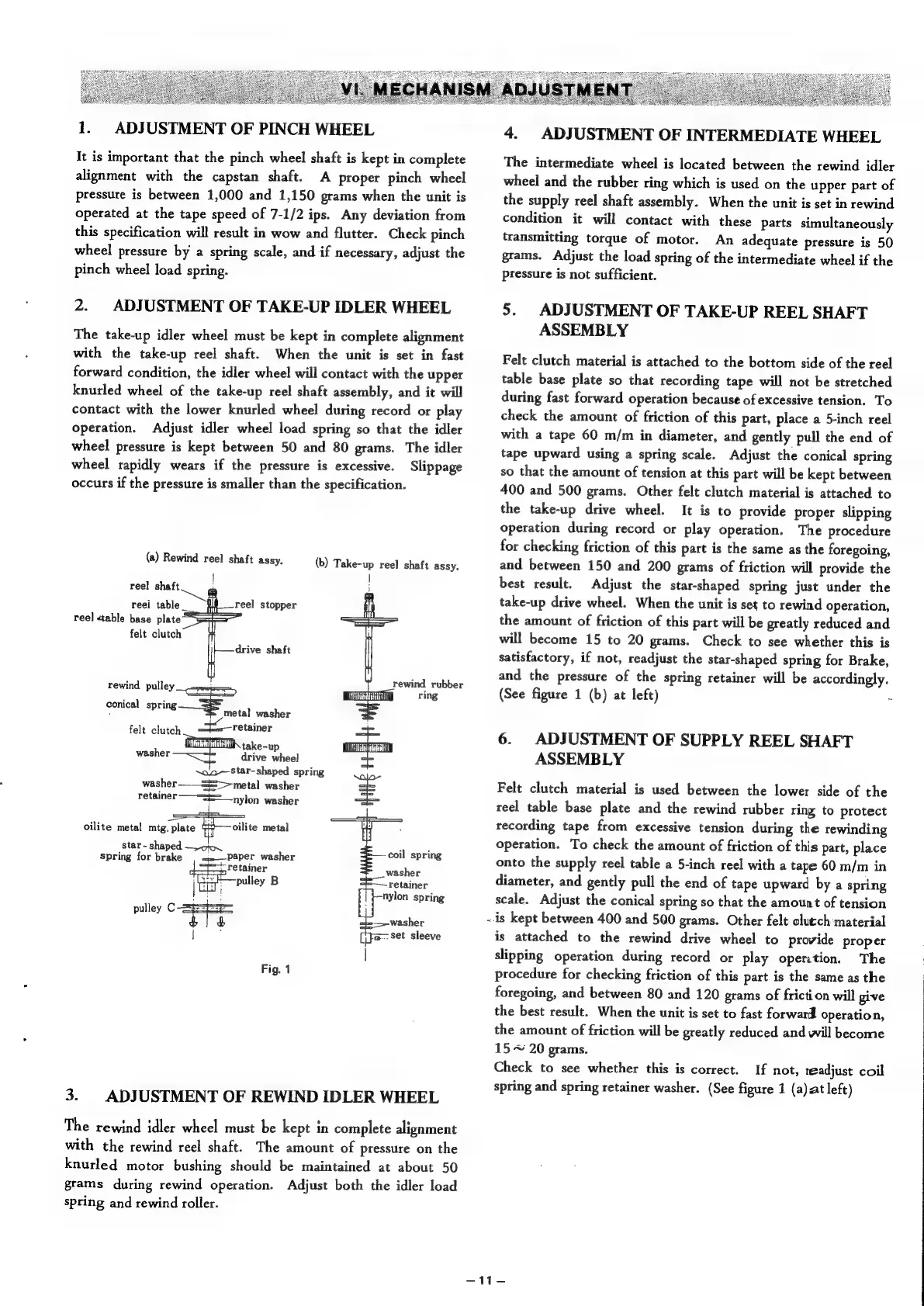 Akai M-9 - VI. MECHANISM ADJUSTMENT; ADJUSTMENT OF PINCH WHEEL; ADJUSTMENT OF TAKE-UP IDLER WHEEL; ADJUSTMENT OF REWIND IDLER WHEEL