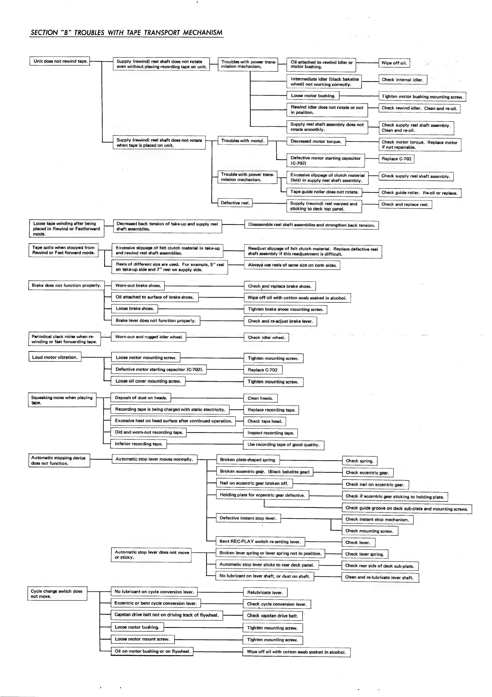 Akai M-9 - SECTION B TROUBLES WITH TAPE TRANSPORT MECHANISM; Unit does not rewind tape.; Capstan rotates in Stop position, but tape does not advance when switched to Play position.; Capstan advances tape, but take-up reel does not take up tape.