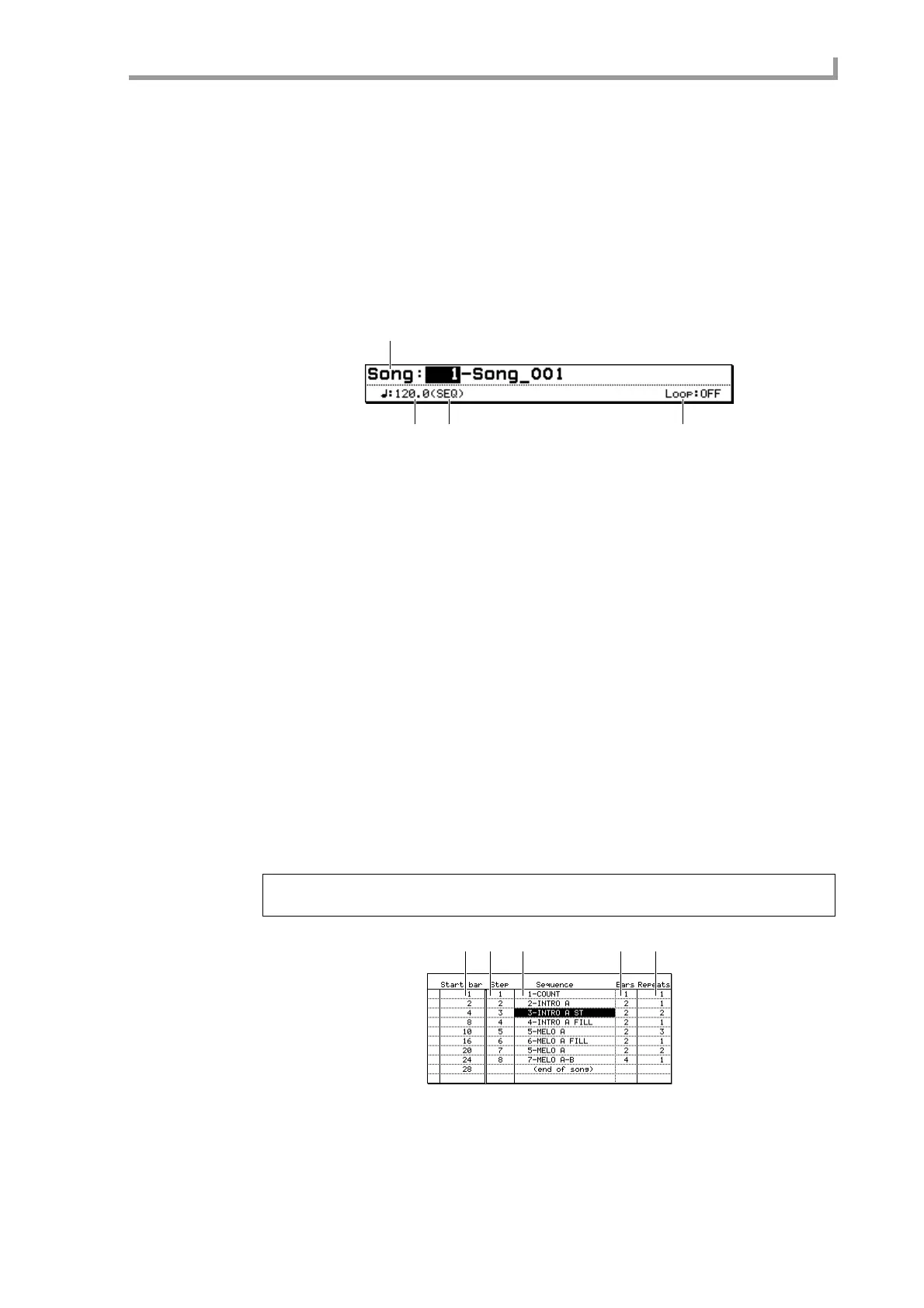 Here you can select the song to be created or played, and turn tempo and looping on/off.