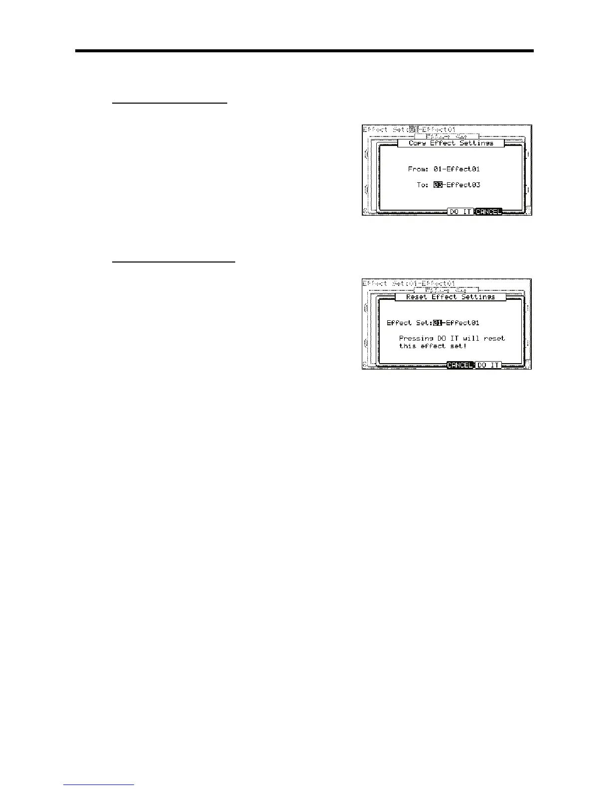 The settings of the effect set selected in the 'Effect' field will be reset to the default settings. Pressing the [F4] (CANCEL) button cancels the