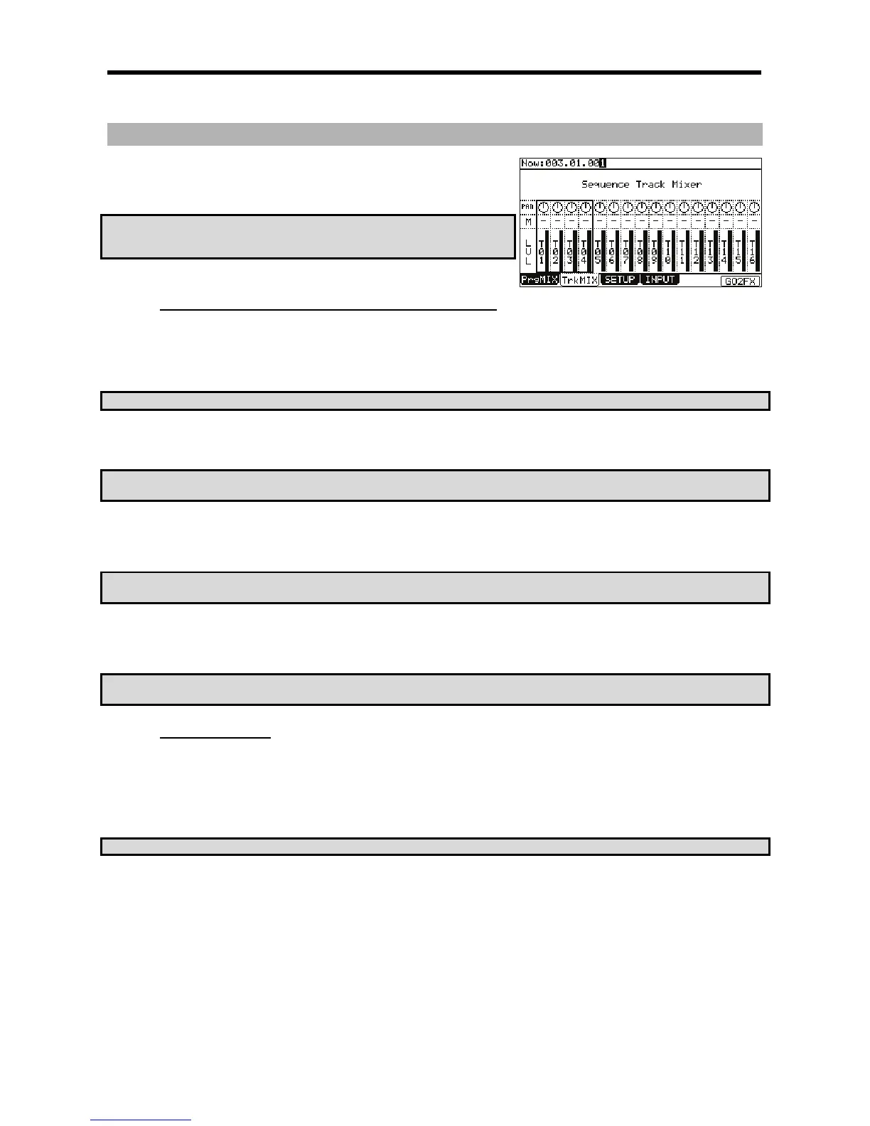 each track, much like faders on a mixing board. You can use the [CURSOR] buttons to move to each field in MIXER mode, and you can adjust