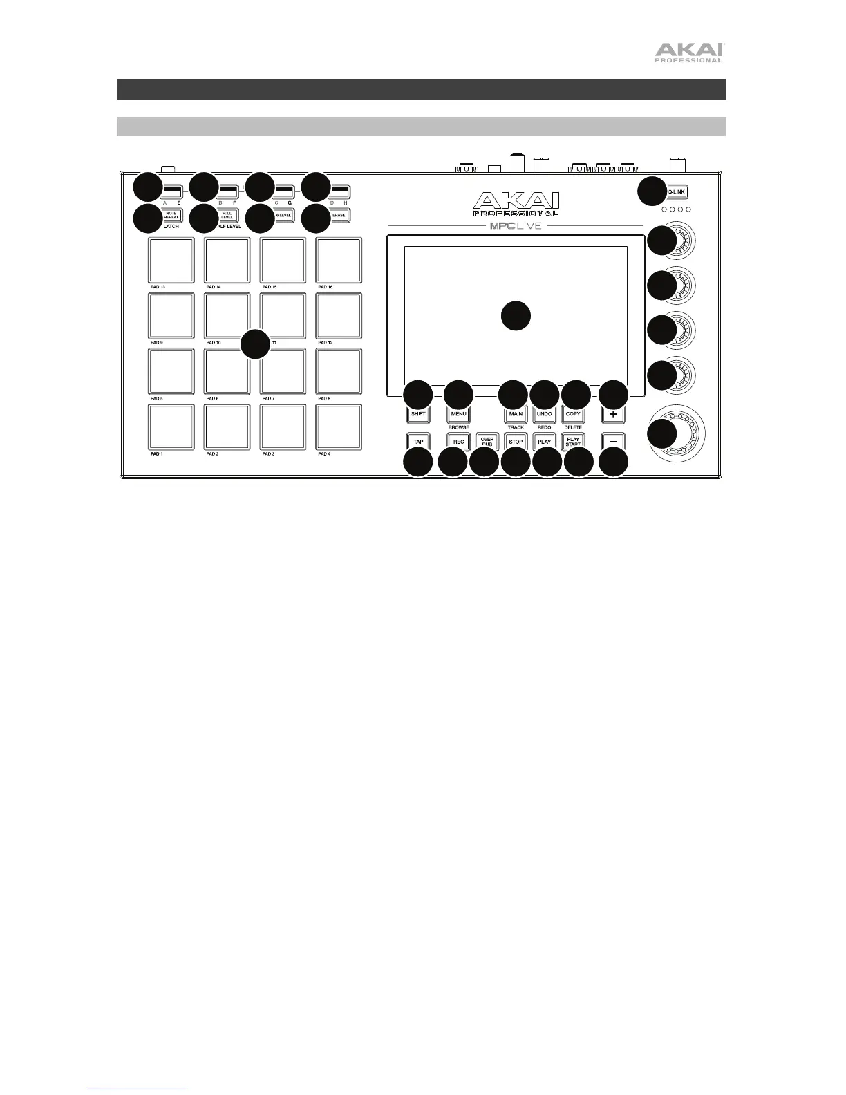 1. Display: This full-color multi-touch display shows information relevant to MPC Live’s