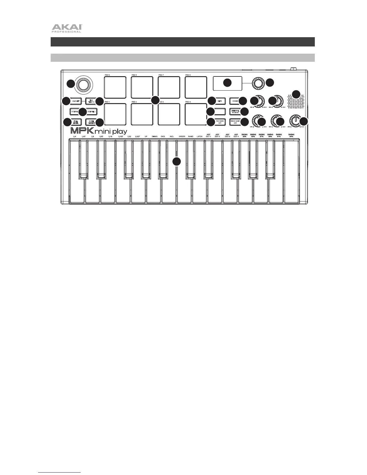 4. Arpegiador: Pulse este botón para encender o apagar el arpegiador. Pulsarlo durante un arpegio