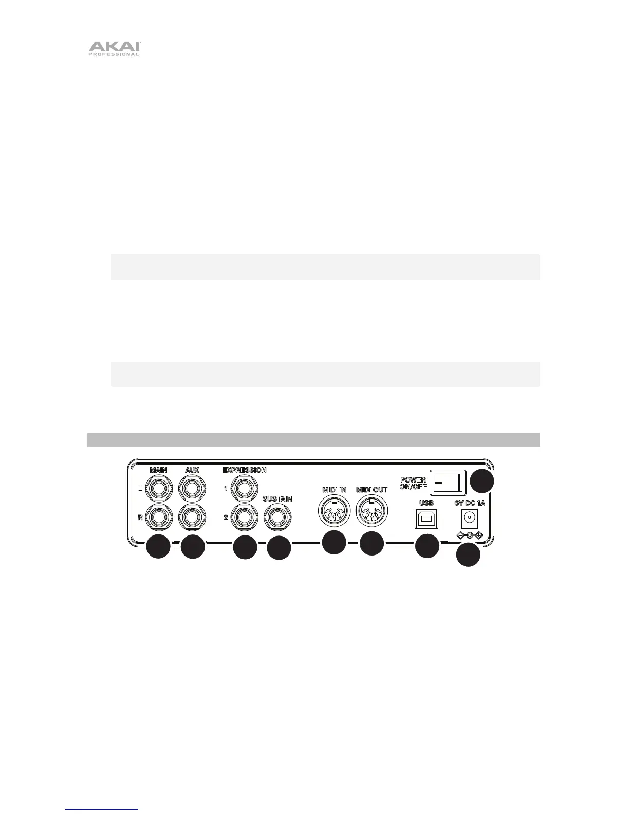 5. Entrée MIDI : Cette entrée permet de relier la sortie MIDI d’un module de sons ou d’un