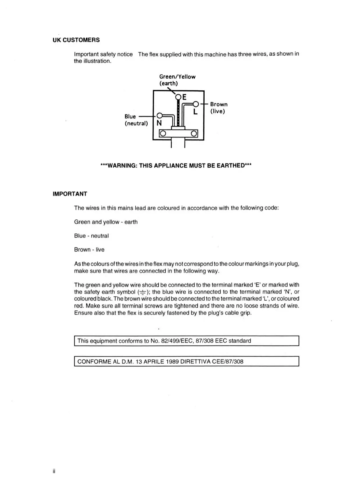Important safety notice The flex supplied with this machine has three wires, as shown in