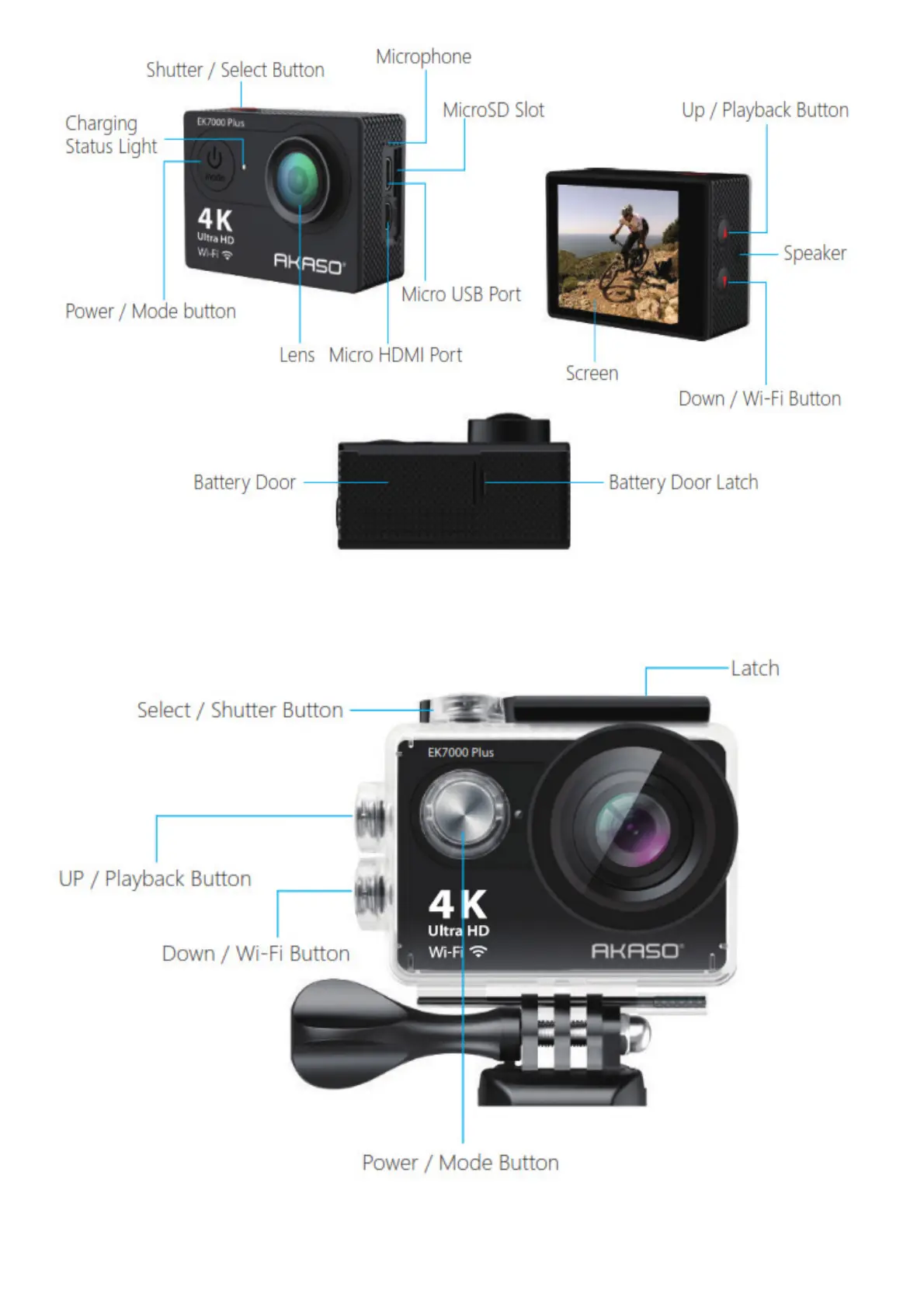 Akaso EK7000 Plus - Camera Setup and Accessories; WATERPROOF CASE; MOUNTING YOUR CAM ERA