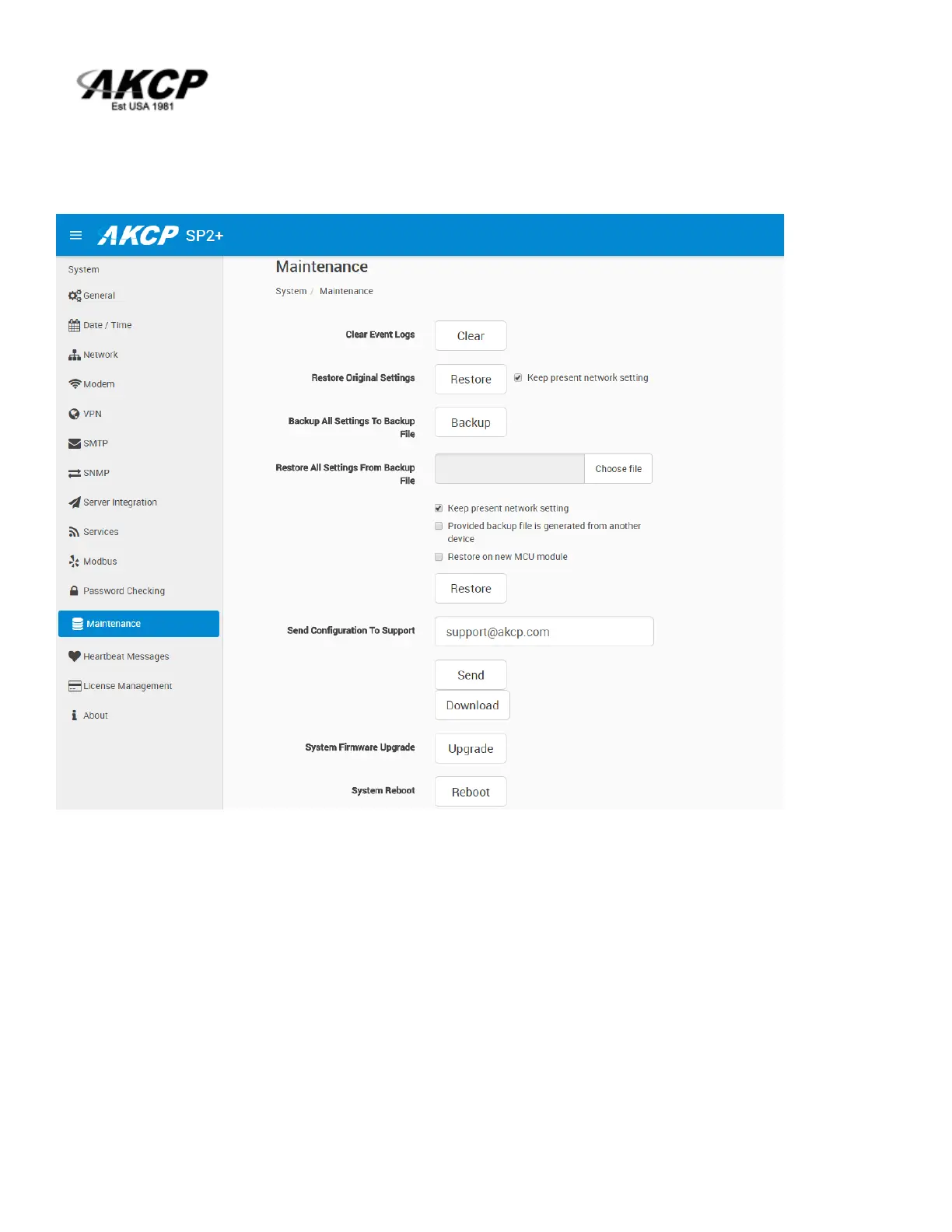 Send Configuration To Support: when asked by Support, this sends the unit’s backup file to us. This