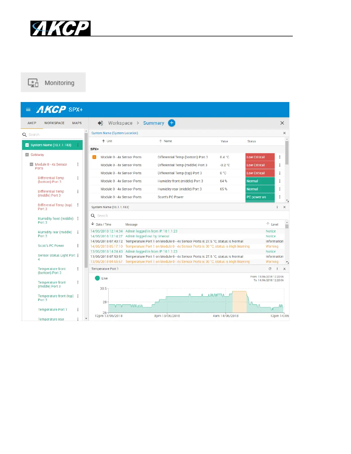 This is the Summary page with Sensor Status and the Event Log, with the Temperature Sensor