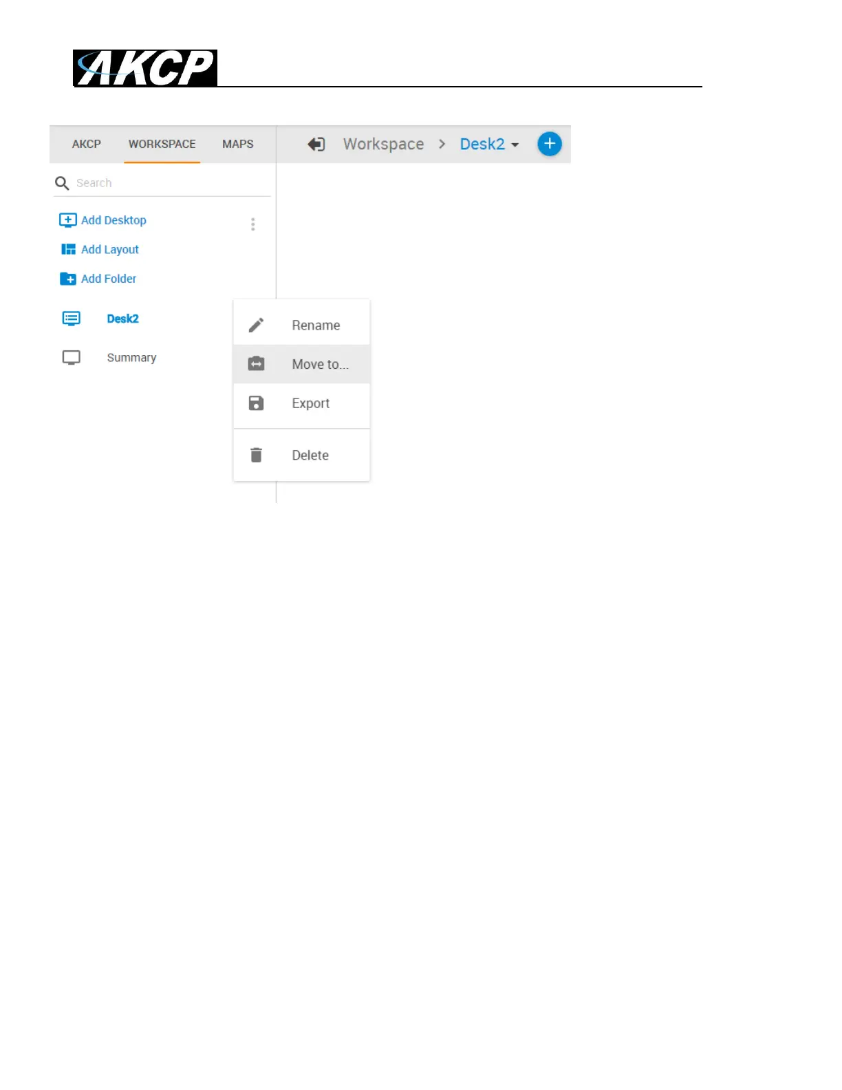 On each Desktop and Folder item, you have the option to Rename, Move, Export or Delete them.