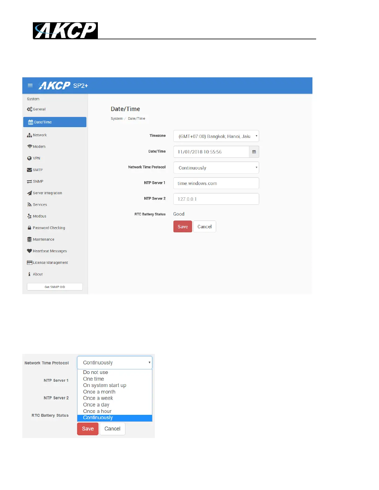 unit is connected to APS (AKCPro Server), then it will sync with the APS NTP service. Also displayed