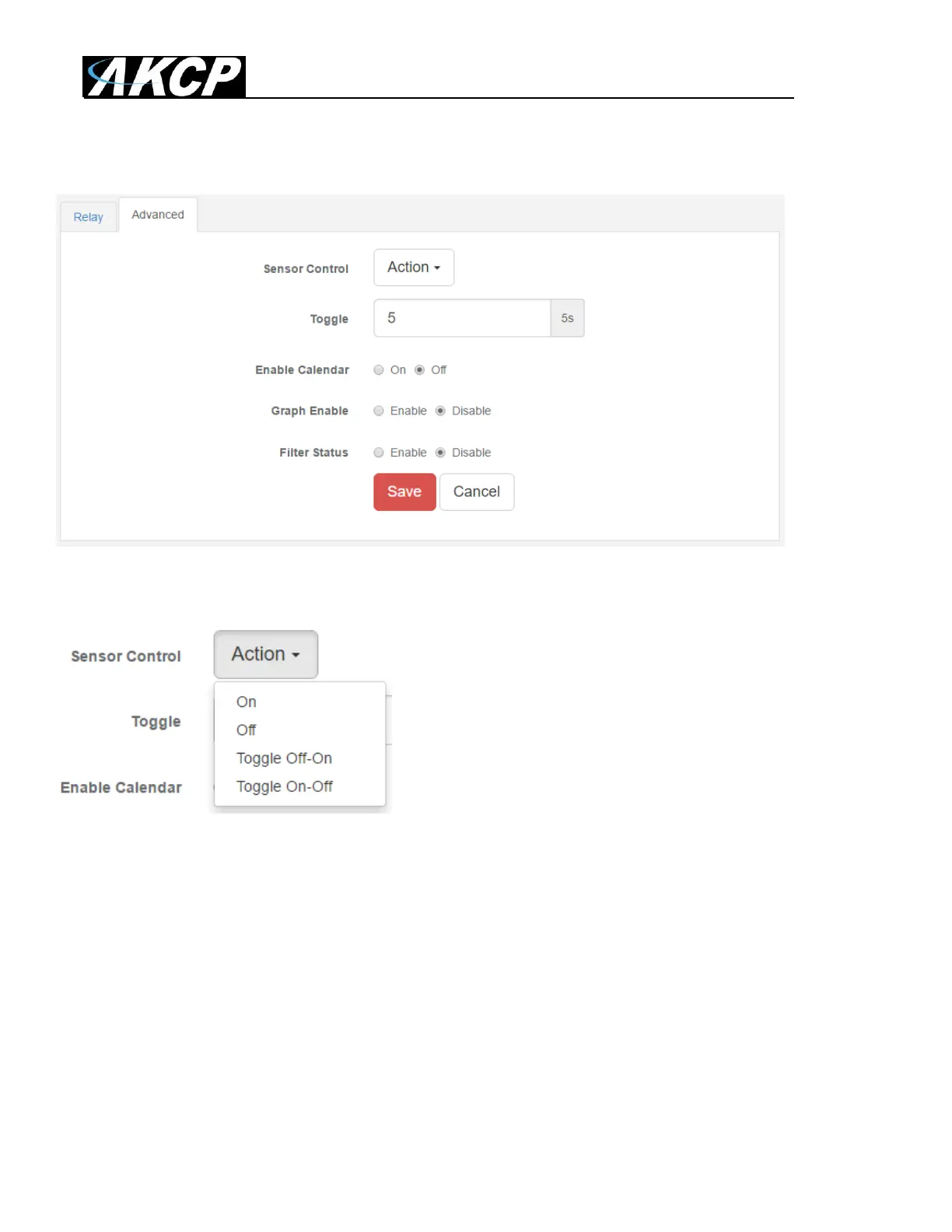 The following actions can be chosen in an action: Turn on until sensor normal, turn off until sensor