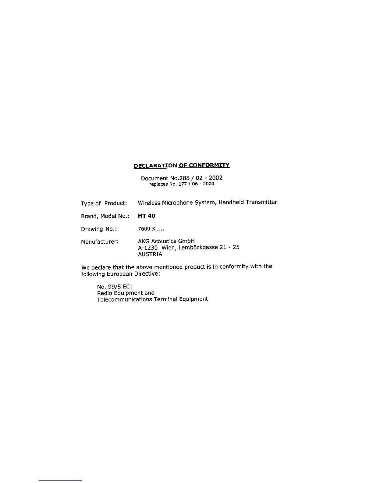 AKG HT 40 - Compliance Information; Declaration of Conformity
