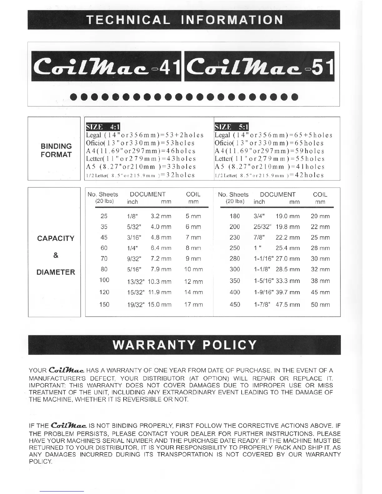 Akiles CoilMac 41 - Technical Specifications; Binding Formats; Punching Capacity & Coil Diameter; Warranty Policy