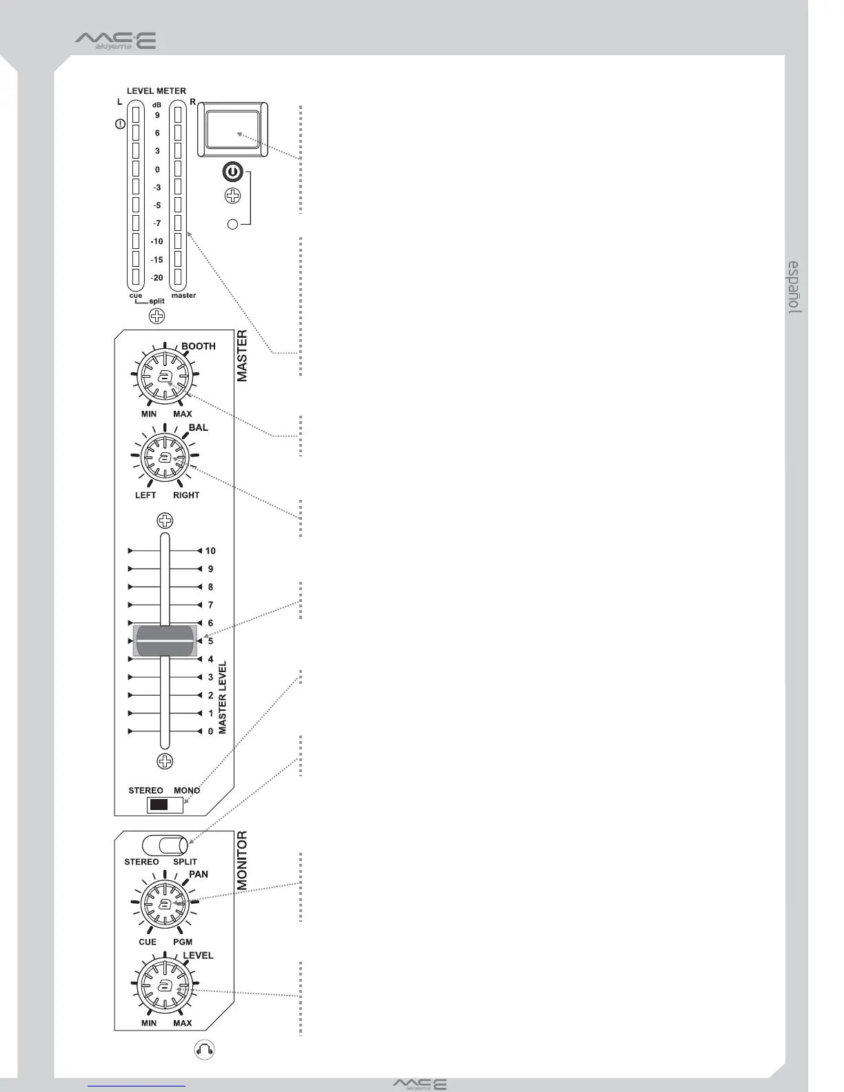 Control de nivel Booth: Controla independientemente de Master un amplificador externo.
