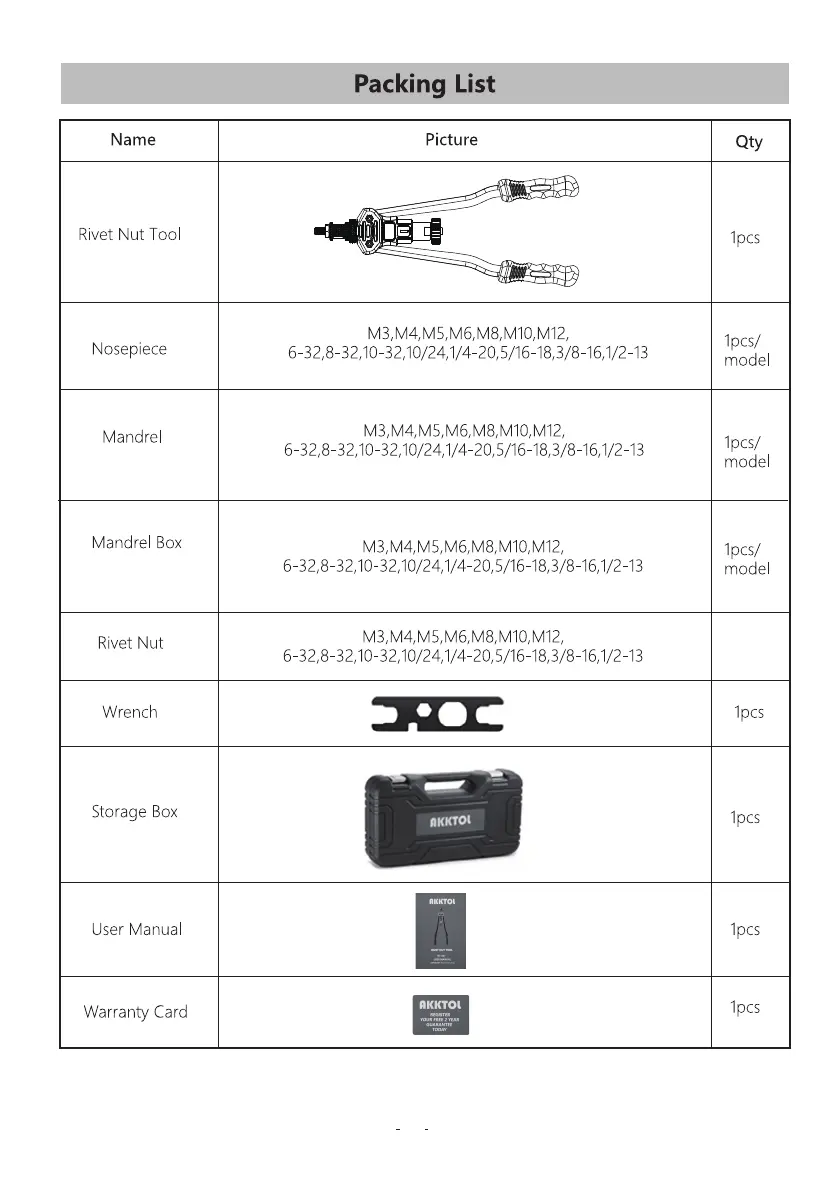 AKKTOL BT-607 - Packing List; Packing List Contents