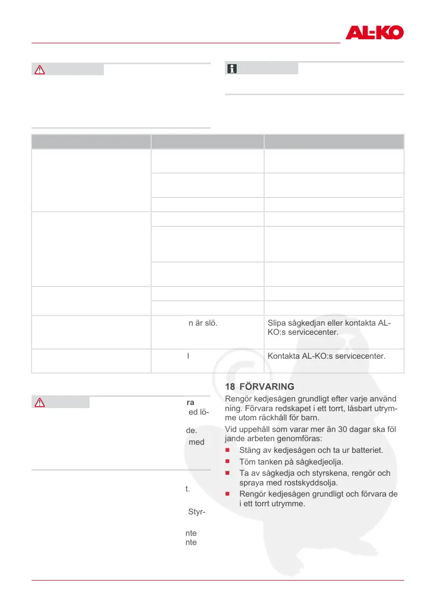 Sågkedjan är slö. Slipa sågkedjan eller kontakta AL-