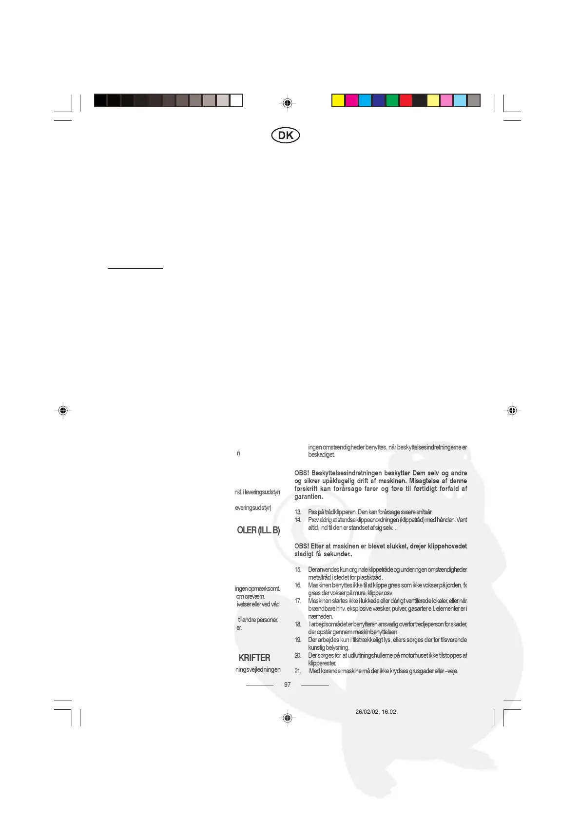 12. Maskinen bruges aldrig uden beskyttelsesindretninger. Den må under