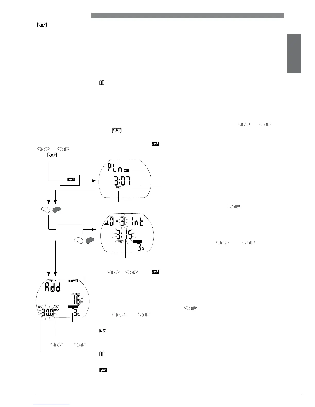 To select the dive planner Aladin must be in user mode (time of day display). Push or until