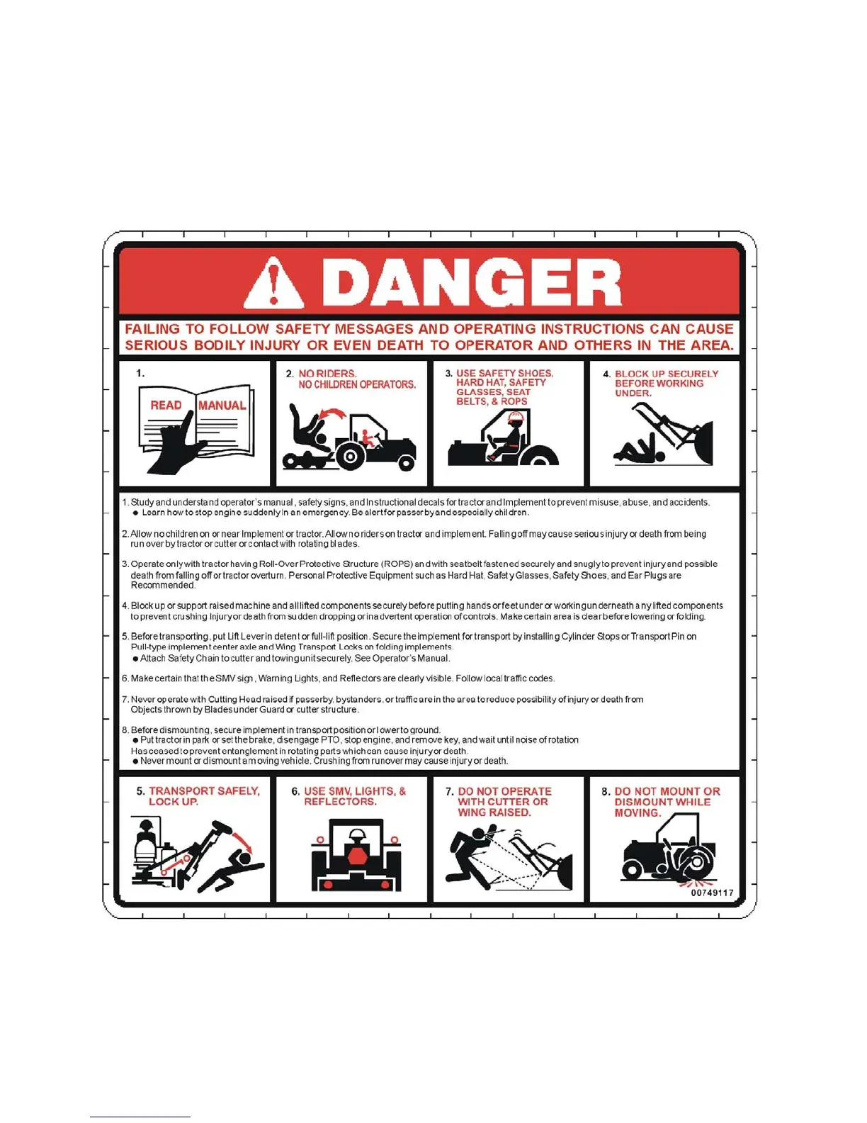 BEFORE YOU START!!Read the safety messages on the implement and shown in your manual. Observe the
