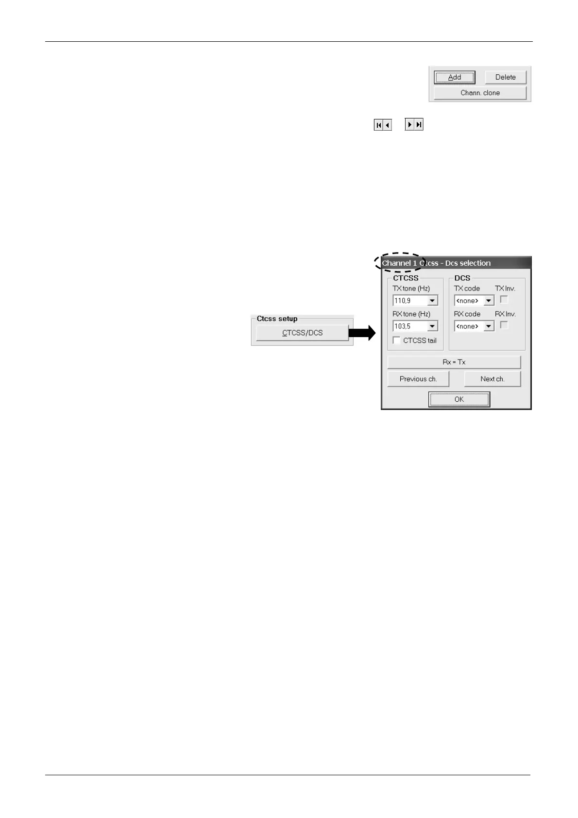 Previous ch. button: you will see the window’s name Channel x Ctcss – Dcs selection showing the selected channel. Go back to step