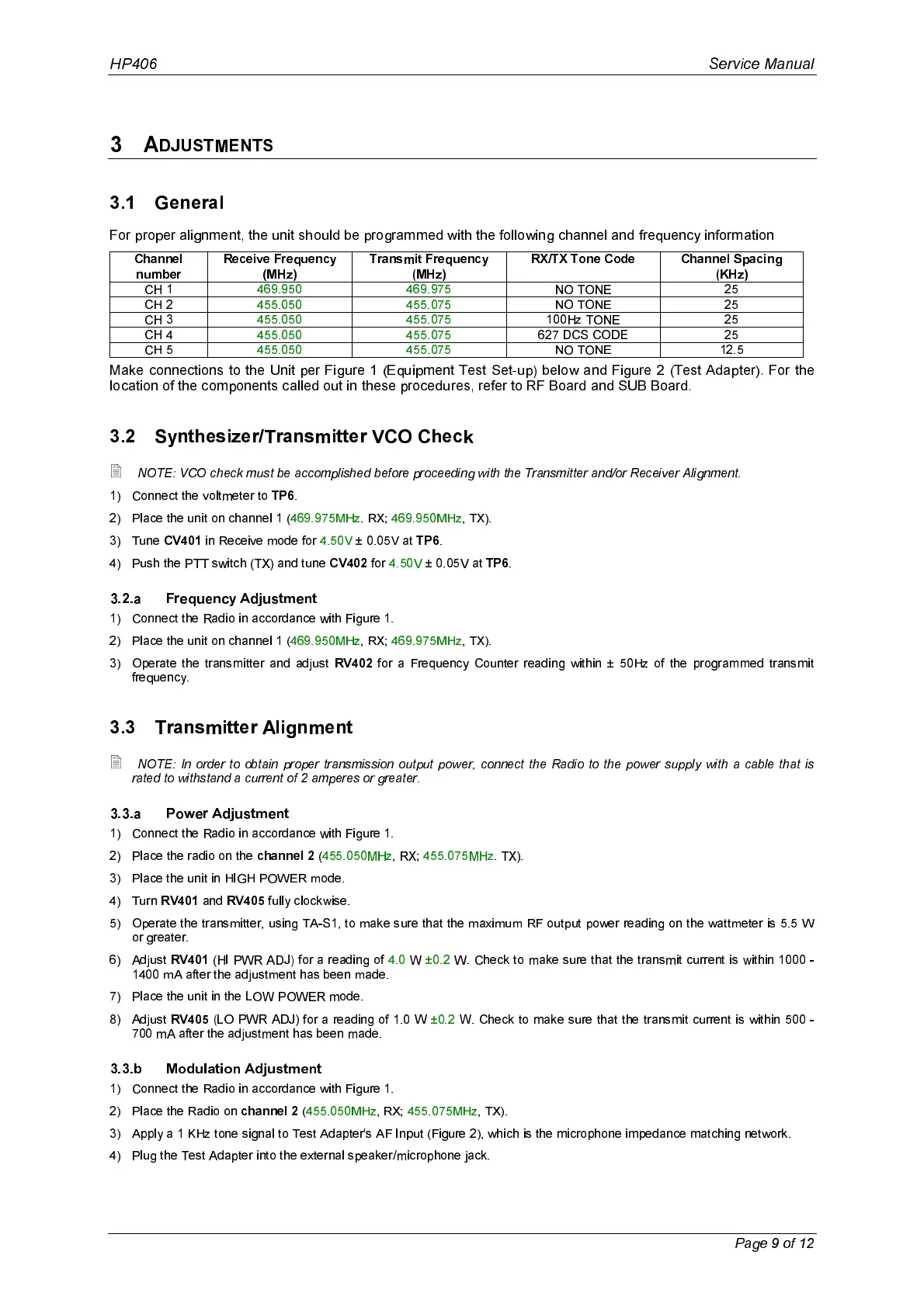 For proper alignment, the unit should be programmed with the following channel and frequency information