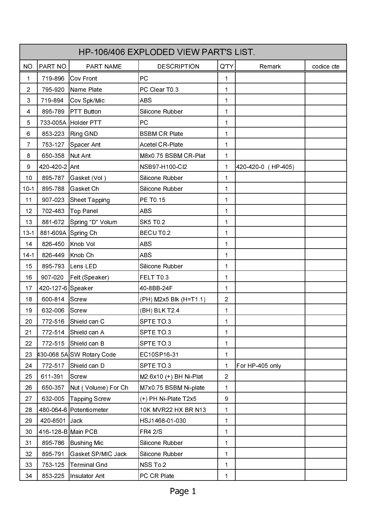HP-106/406 EXPLODED VIEW PART'S LIST.