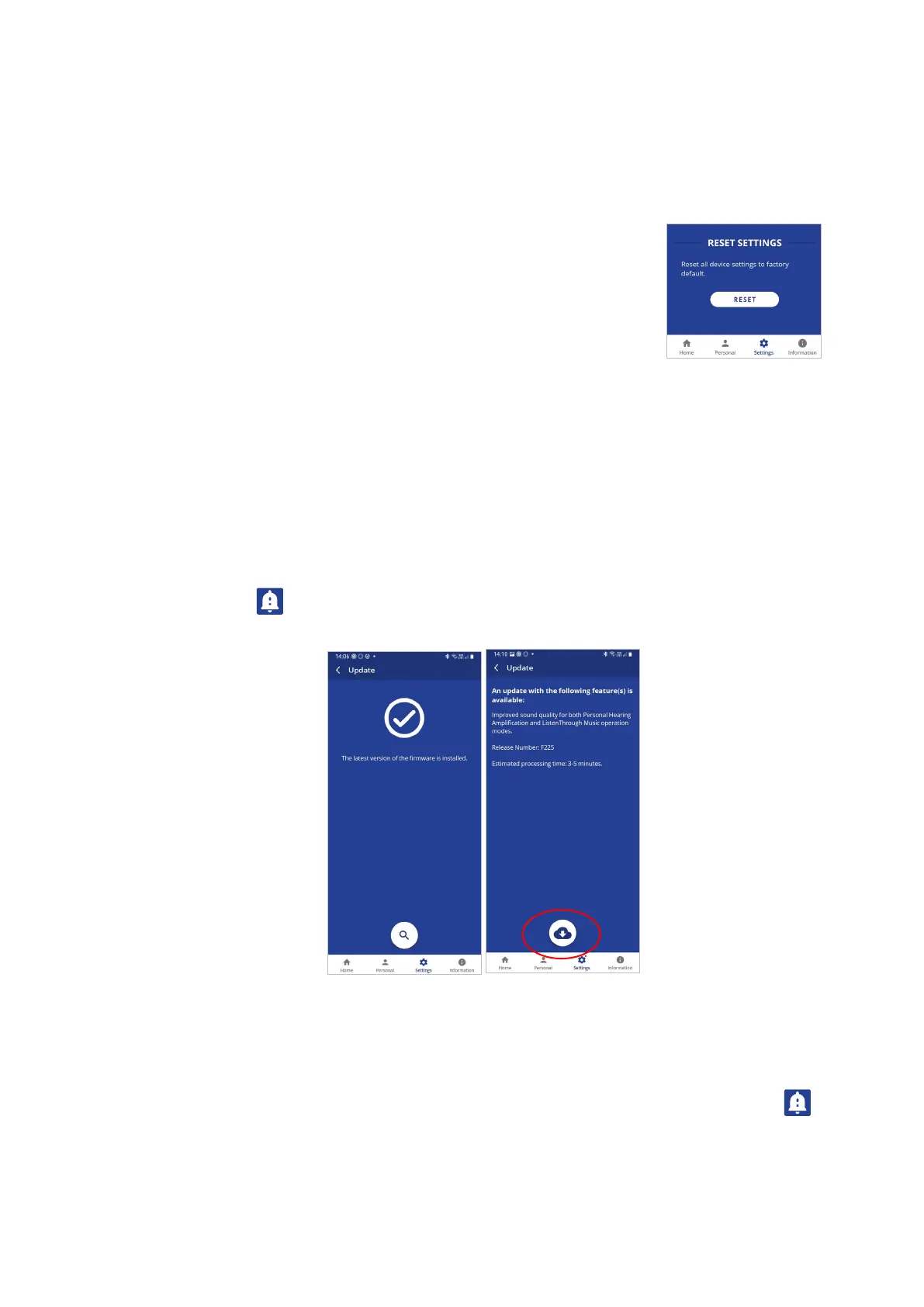 The app supports firmware updates of the connected BeHear SMARTO amplifier, allowing users