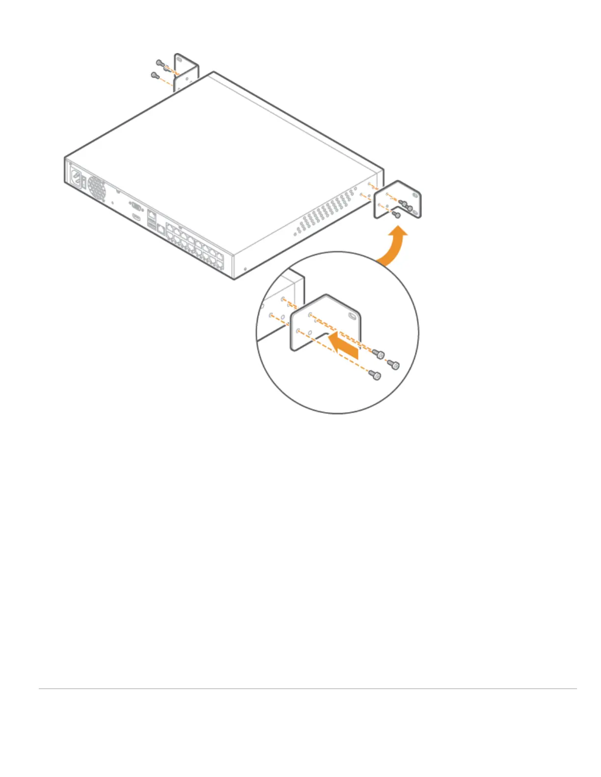 3. À l’aide de vis pour bâti de serveur (non incluses), fixez les supports de chaque côté du bâti.