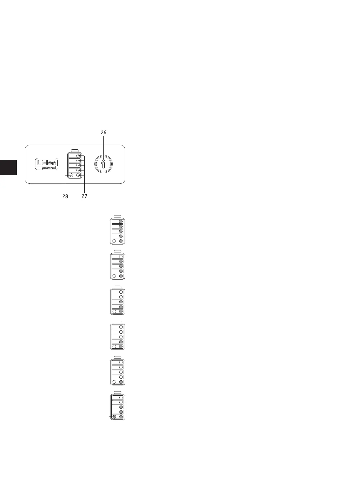 5 LEDs leuchten – der Akku-Pack ist zu 100% aufgeladen. Vermeiden Sie an Gefällen