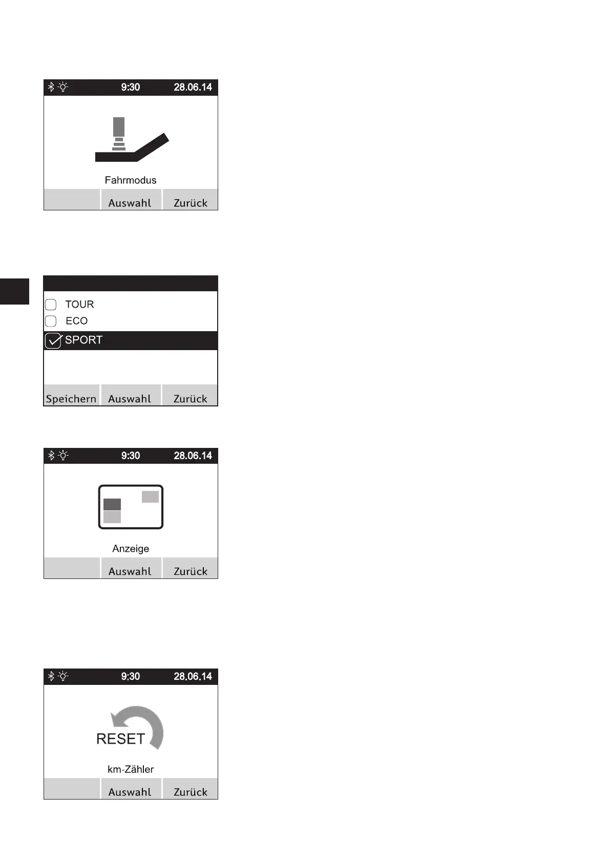 ter TOUR, ECO, SPORT und (sofern aktiviert) CUSTOM aufgeführt werden.