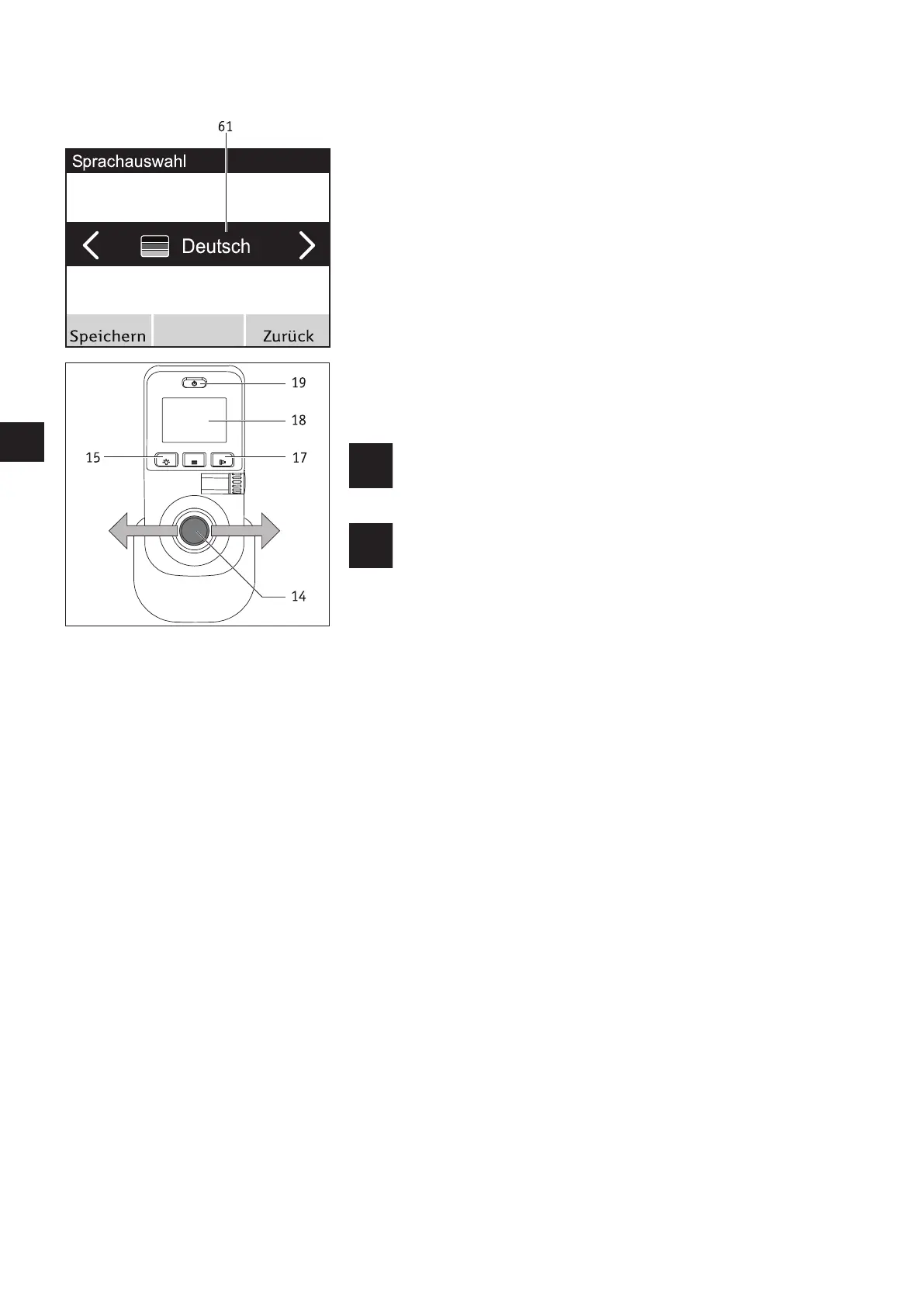 • Durch Bewegen des Joysticks [14] nach links oder rechts werden im Auswahlfeld [61]
