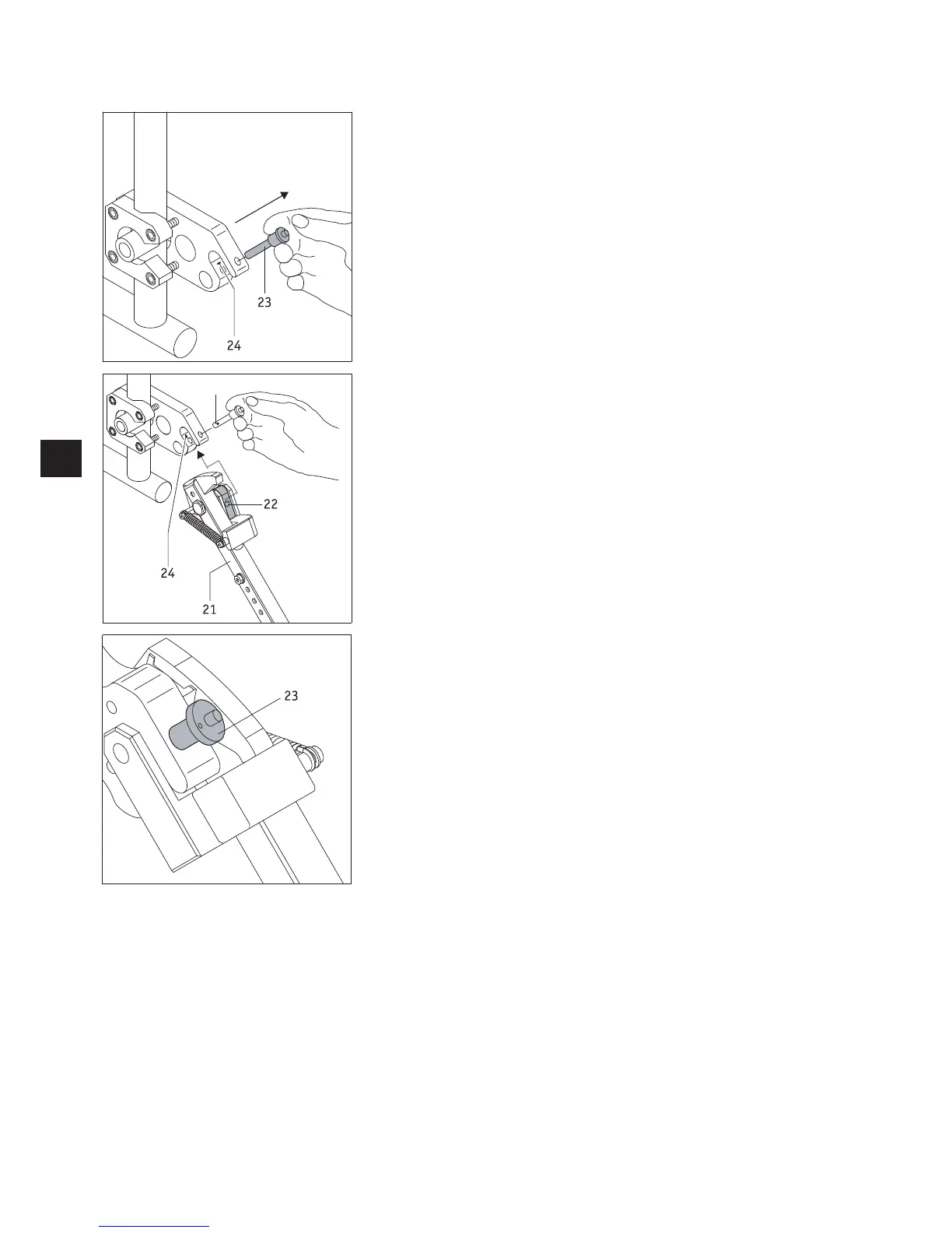 • Lock the bracket mounting fork [24] in place using the quickpin [23]. To do this,