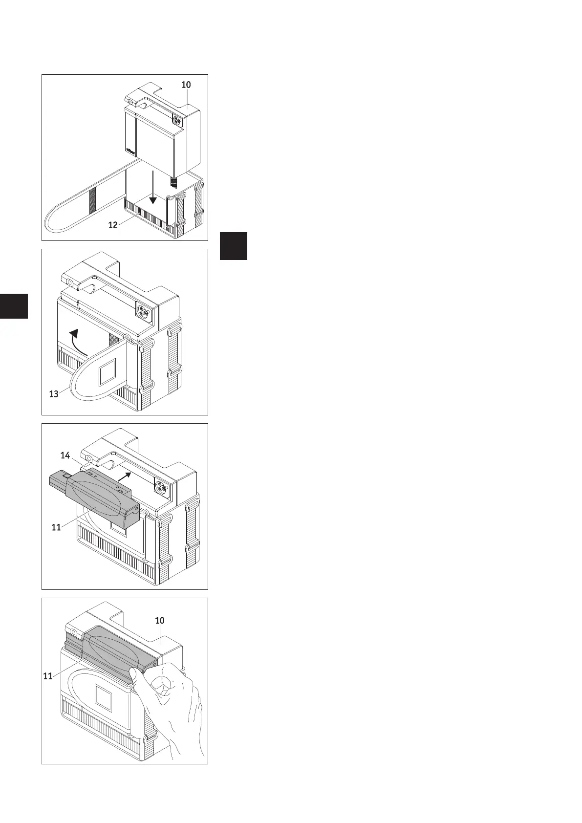 • Put the battery pack [10] in the battery pack bag [12] as shown in the diagram