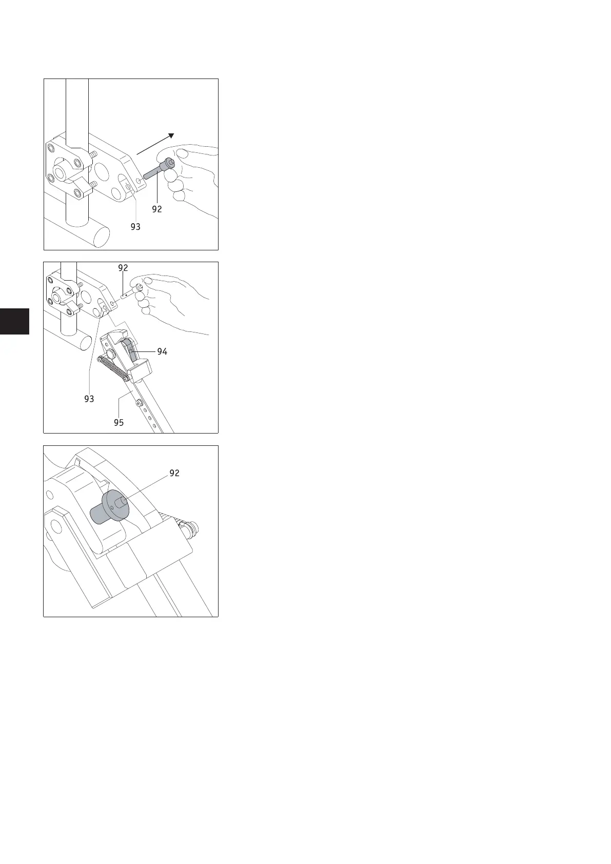 • Check that the quickpin [92] holds fast in the bracket mounting fork [93]. It must not