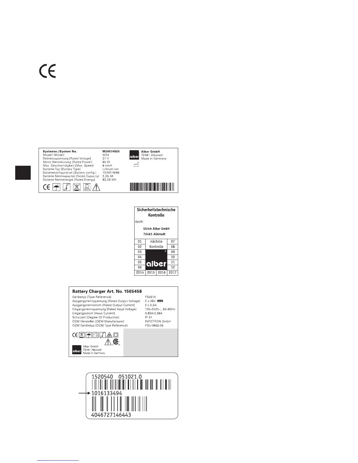 There are labels on the wheels and the battery charger which contain various details on the product. In the event of a system defect, com-