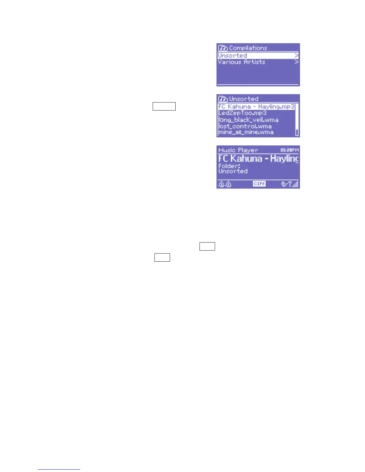 CIFS/USB: folder, path, bit rate/codec/sampling rate, playback