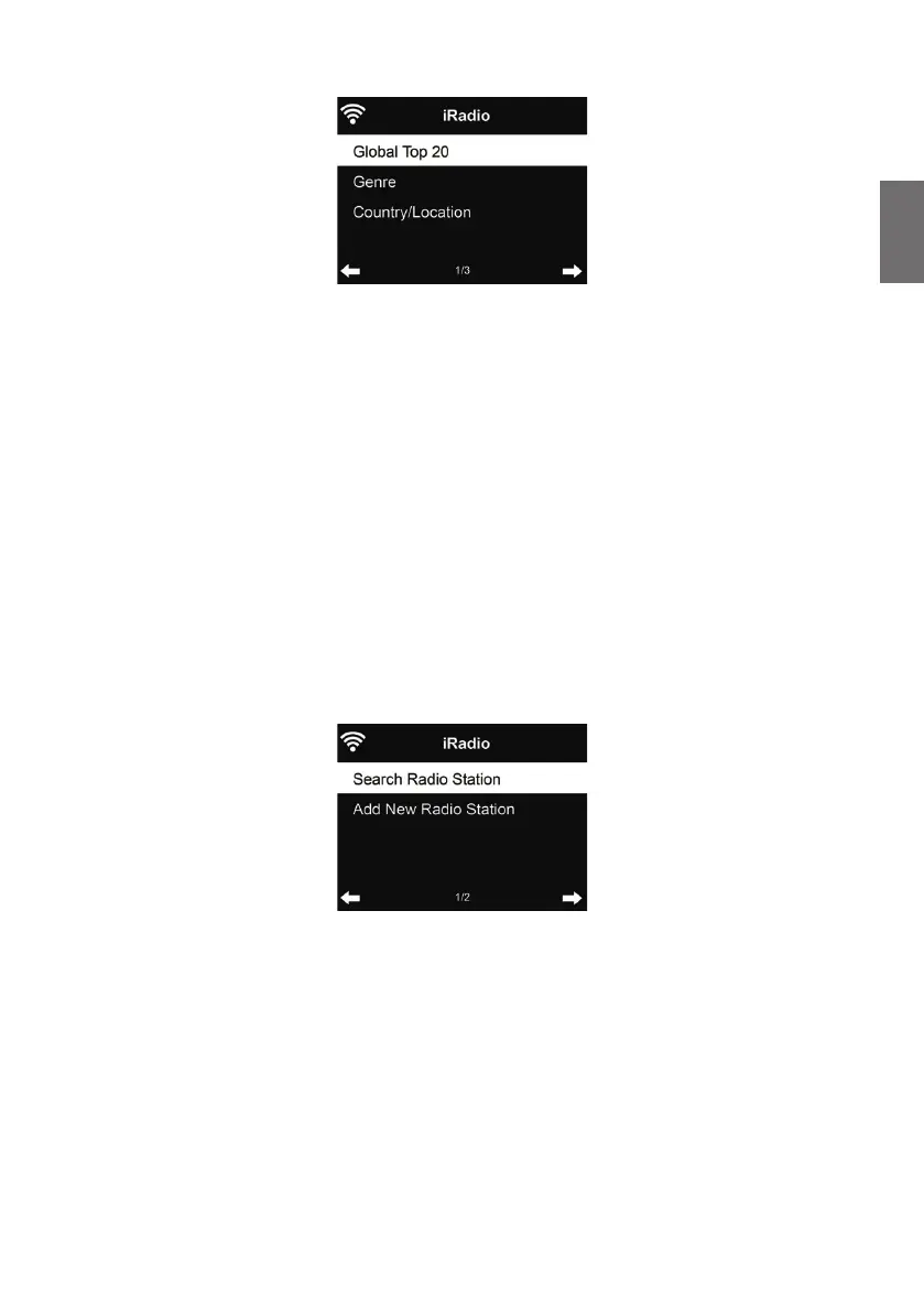 Stations are categorized into Global Top 20, Genre and Country/Location. Enter to continue the