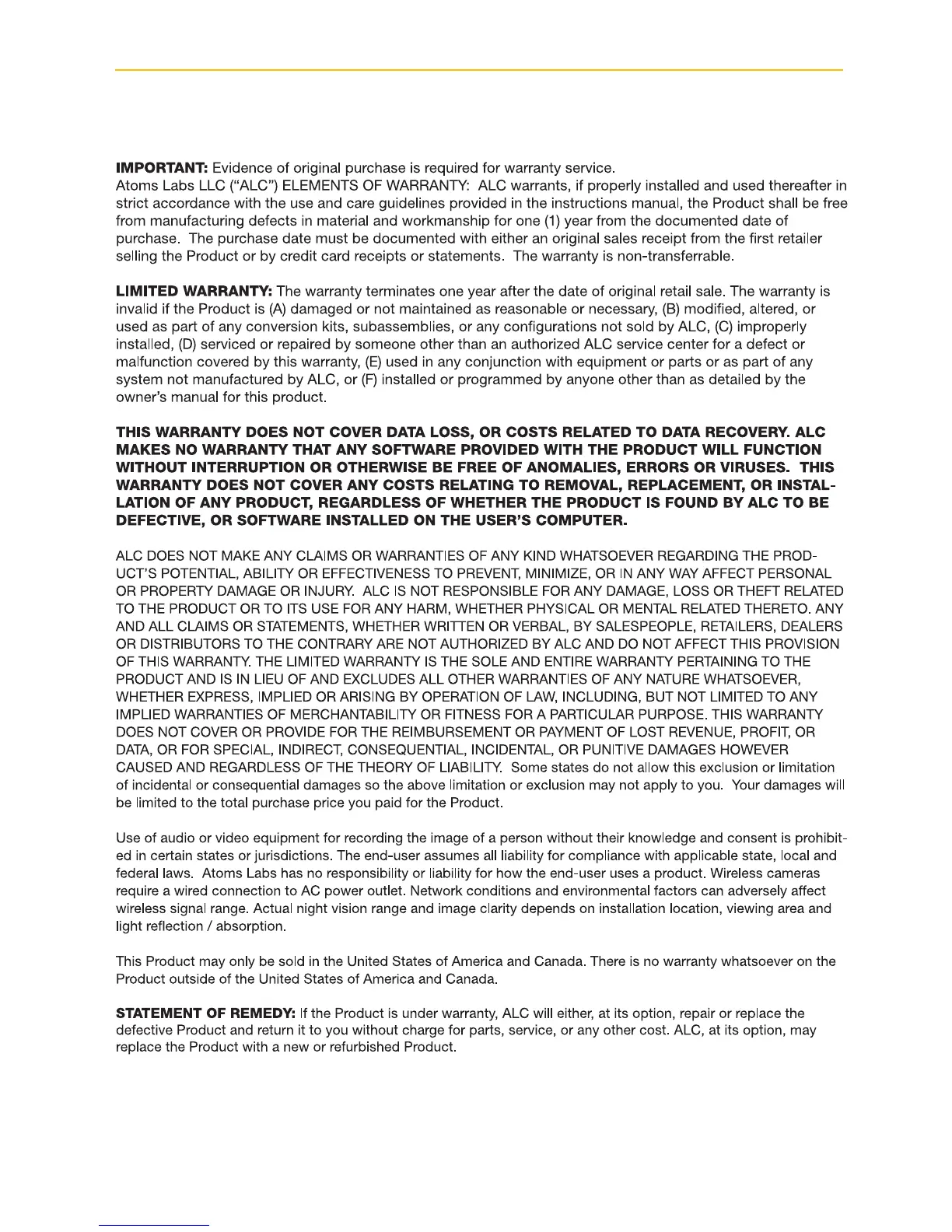 ALC AWF61 - Warranty