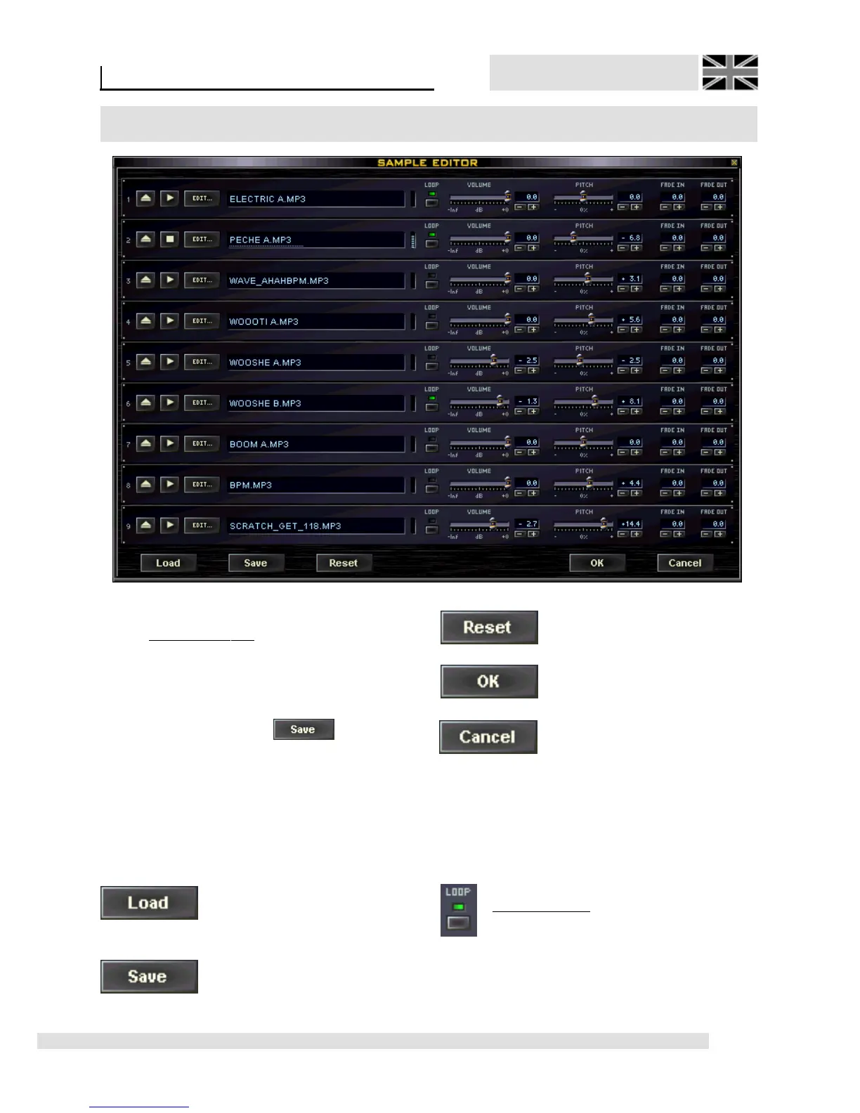 adjustments like LOOP, VOLUME, PITCH FADE