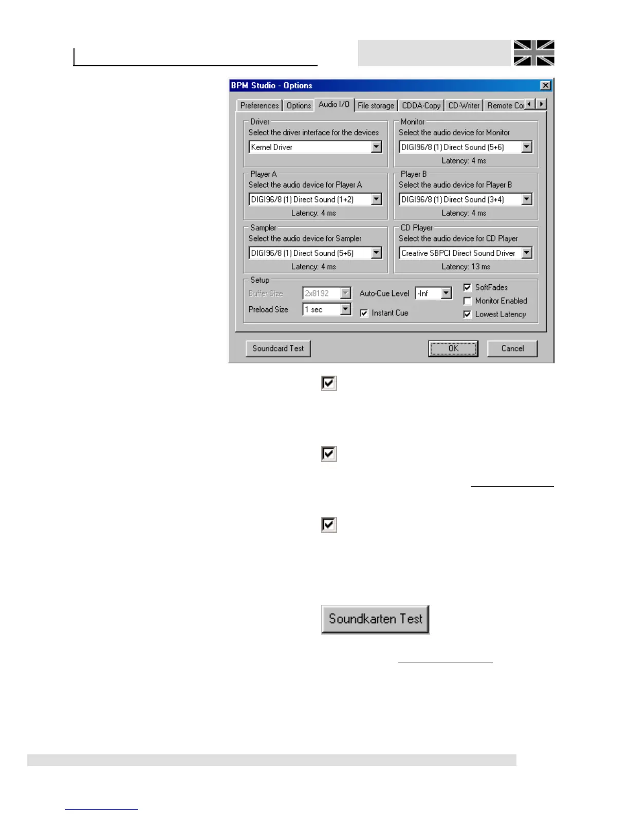 Starts the sound card test. More information is